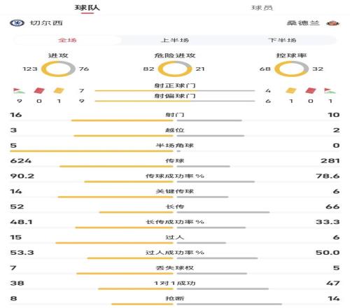 切尔西vs桑德兰全场数据:射门1610,控球率68%32%