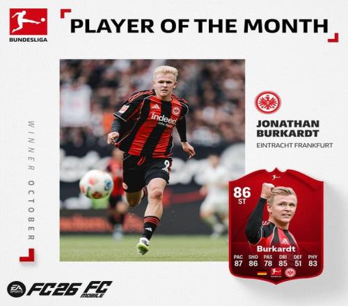 官方:法兰克福前锋伯卡特当选德甲10月最佳球员
