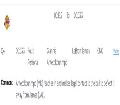 最后40.5秒,字母哥对詹姆斯的上篮尝试进行了合法封盖。(注:报告上没有提到打到詹姆斯手的特纳)