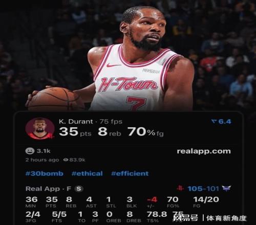 让我们把时钟拨回去年夏天:当36岁的杜兰特与火箭签下2年9000万合同时,所有人都以为休斯顿将迎来新的王朝。但现实却像他小腿皮肤的蜕变一样充满反差。,这位历史级得分手场均"仅"贡献26分5.4篮板4.4助攻,数据看似稳定,却难掩统治力下滑的真相。对比他在总决赛G3的43分13篮板,或是篮网时期对阵活塞的51分神迹,如今的杜兰特更像台精密运转却缺乏爆发力的机器。